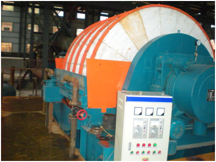 Cuando se trabaja, el disco de filtro gira en el depósito de lechada. Con la ayuda de la diferencia de presión generada por la bomba de vacío, la partícula es absorbida sobre la tela del disco y forma una torta de filtro con un cierto espesor. El filtrado se descargará desde el eje central a través de la torta de filtro y el paño, y la torta de filtro caerá bajo la presión del escarificador y el soplador, y luego caerá en el tanque de la torta del filtro de descarga.
